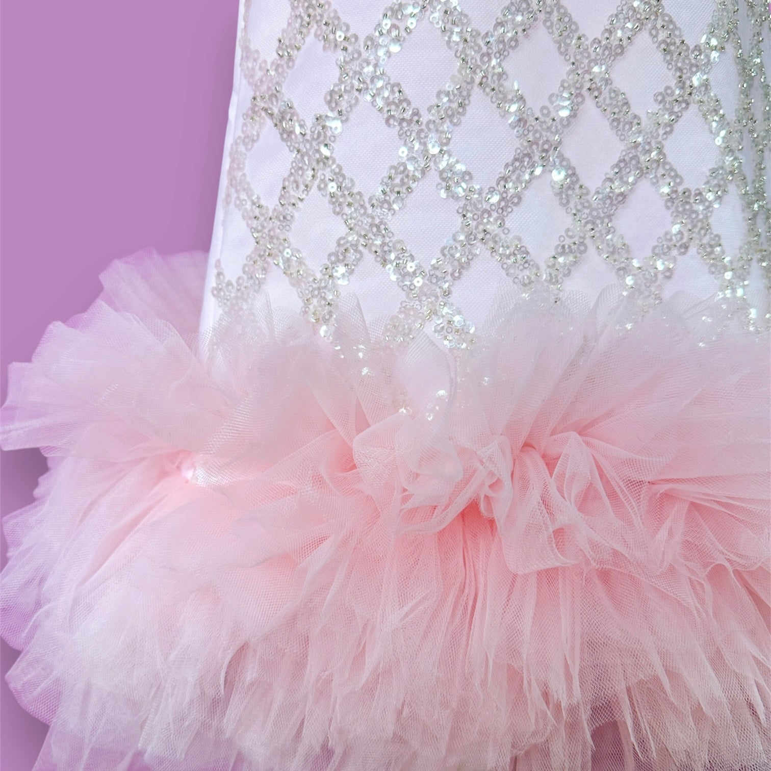 Elegante roze feestjurk voor meisjes met een verfijnde, glanzende bovenlaag versierd met handgeplaatste pailletten in een luxe ruitpatroon. De halslijn is afgewerkt met een satijnen strik voor een nette en stijlvolle touch.