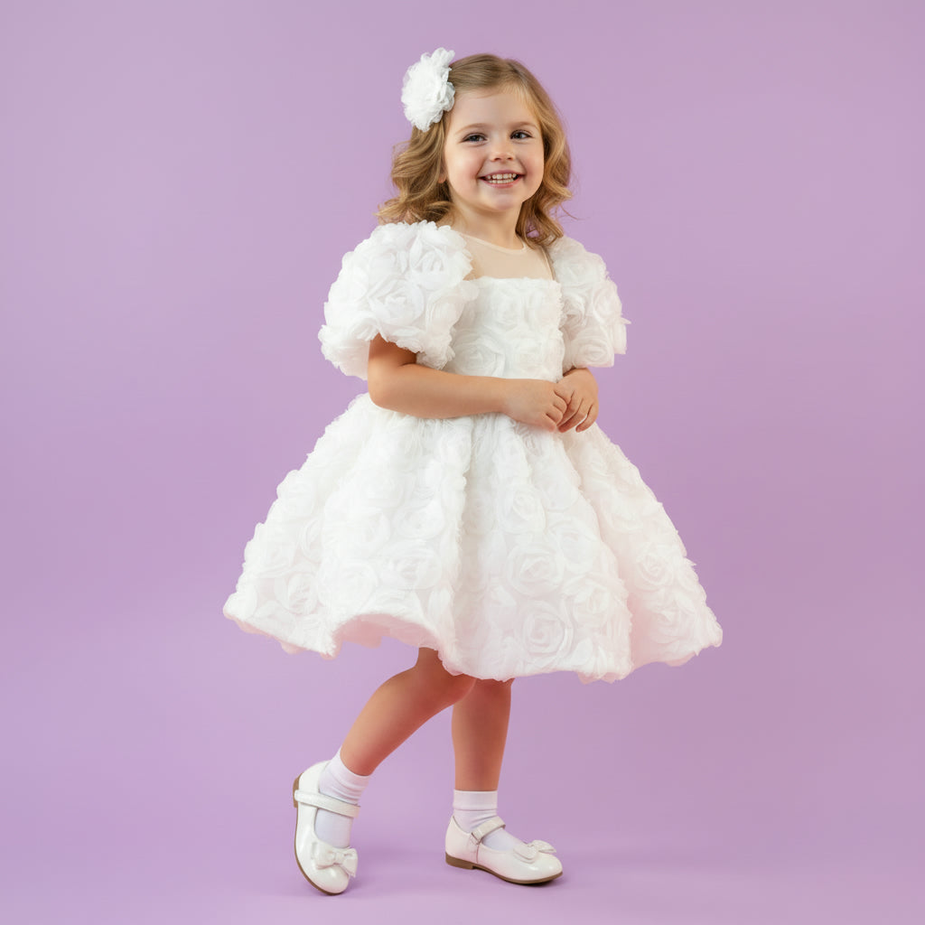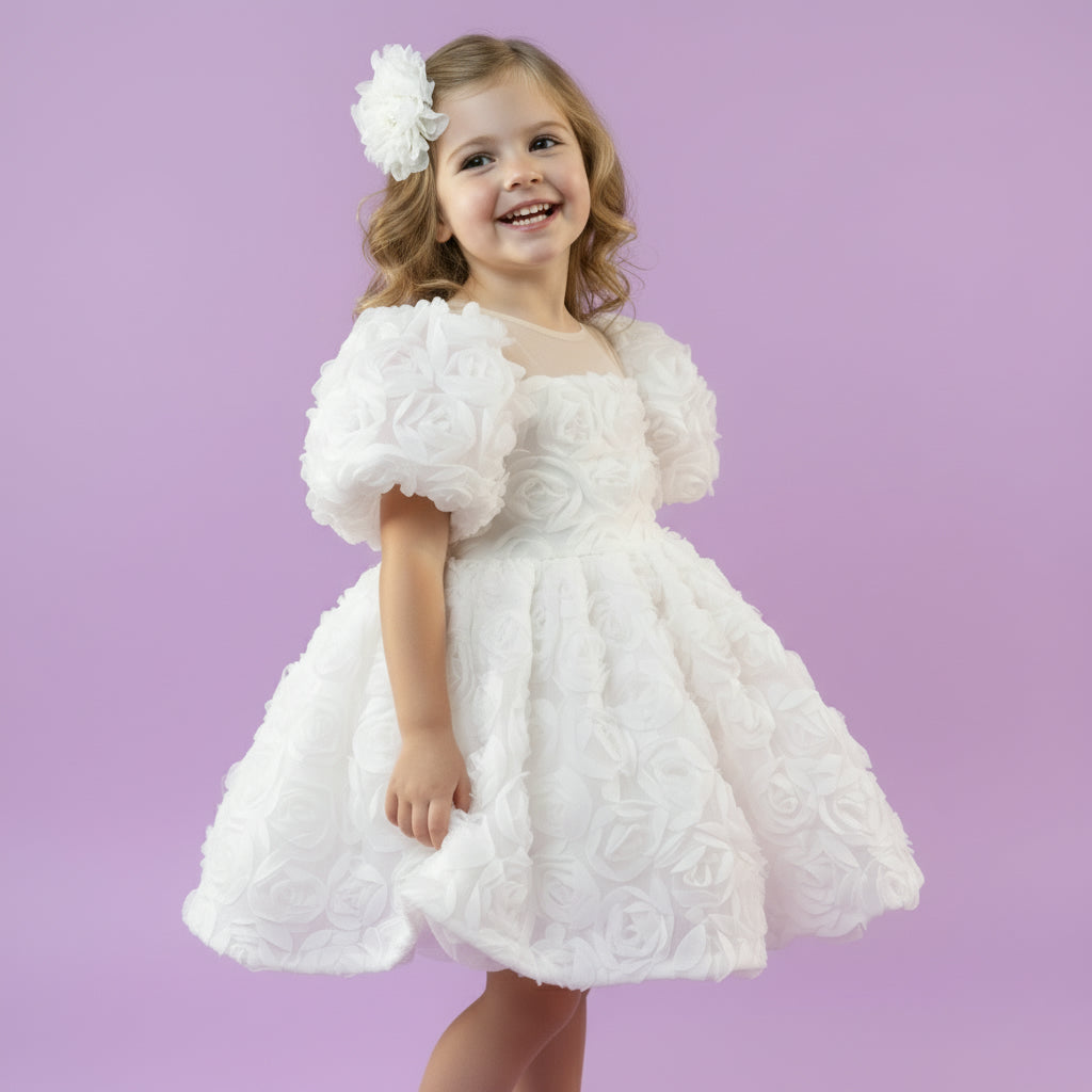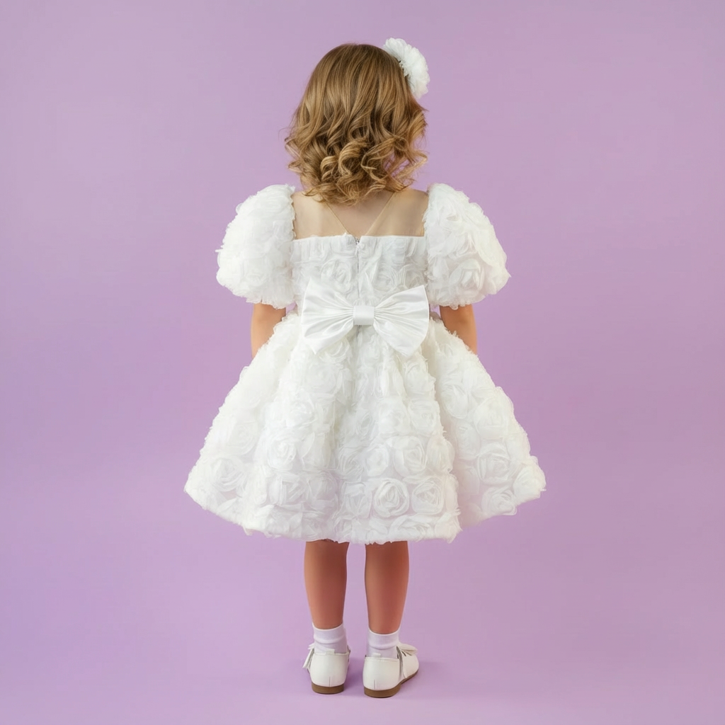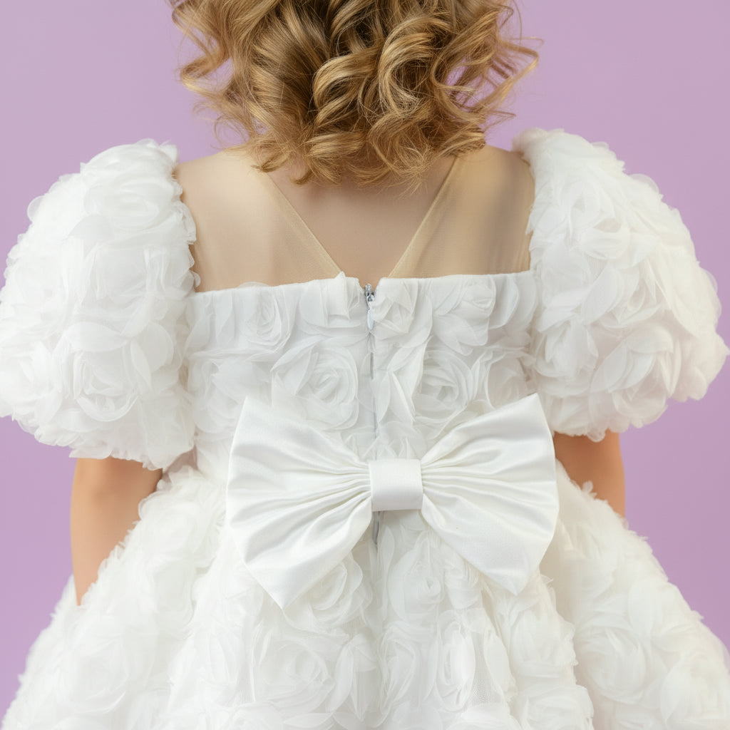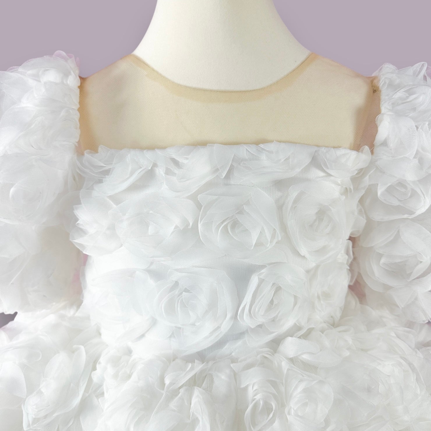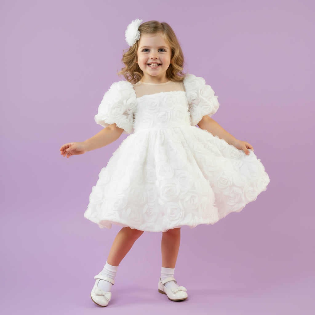 Elegante witte feestjurk voor meisjes met een klassiek A lijn model en 3D bloemen. De jurk is handgemaakt en heeft pofmouwen, een onzichtbare ritssluiting aan de achterkant en een satijnen strik.