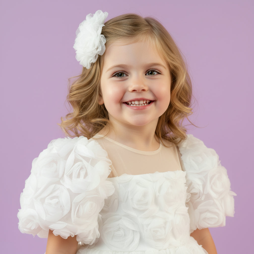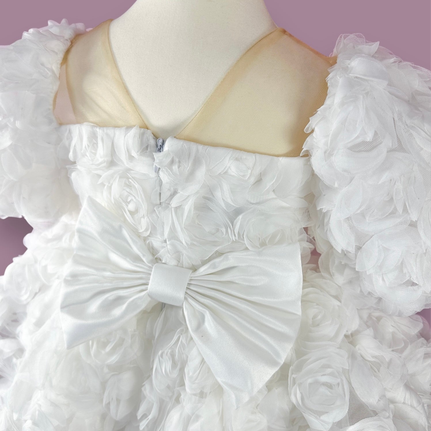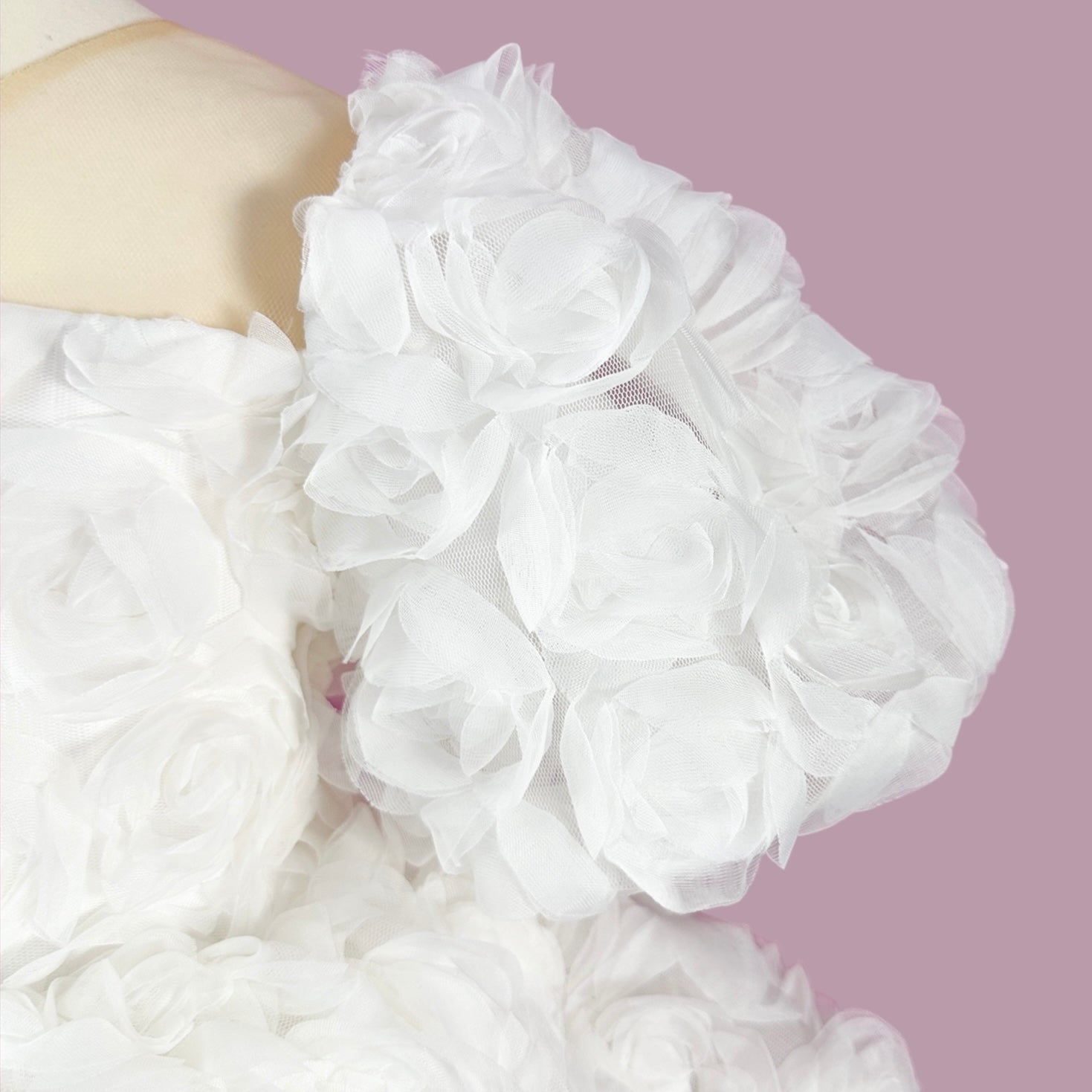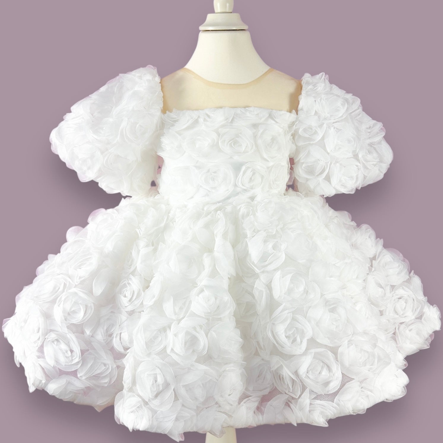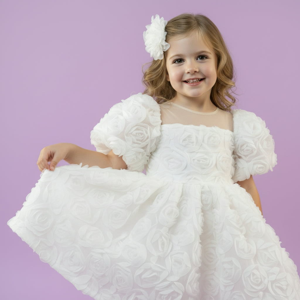 Elegante witte feestjurk voor meisjes met een klassiek A lijn model en 3D bloemen. De jurk is handgemaakt en heeft pofmouwen, een onzichtbare ritssluiting aan de achterkant en een satijnen strik.