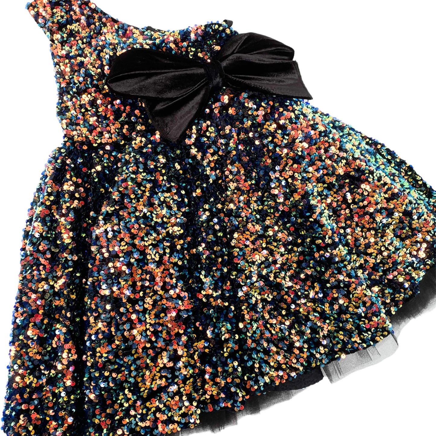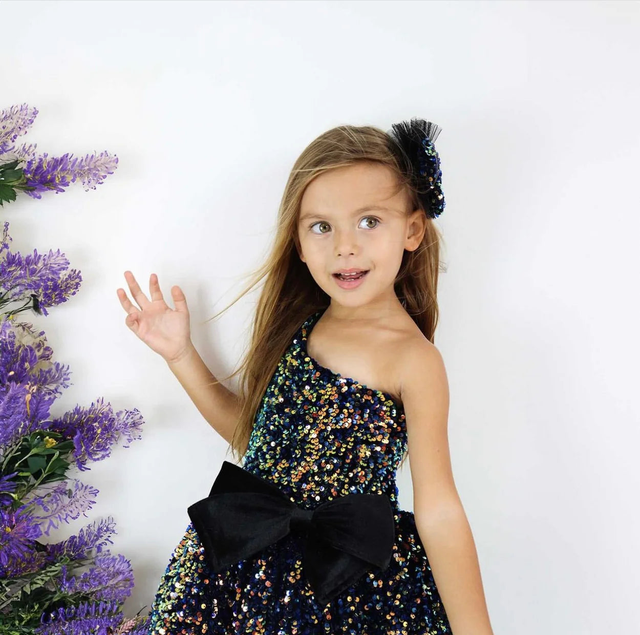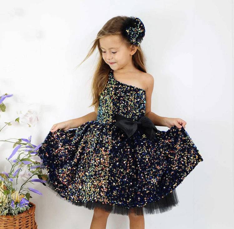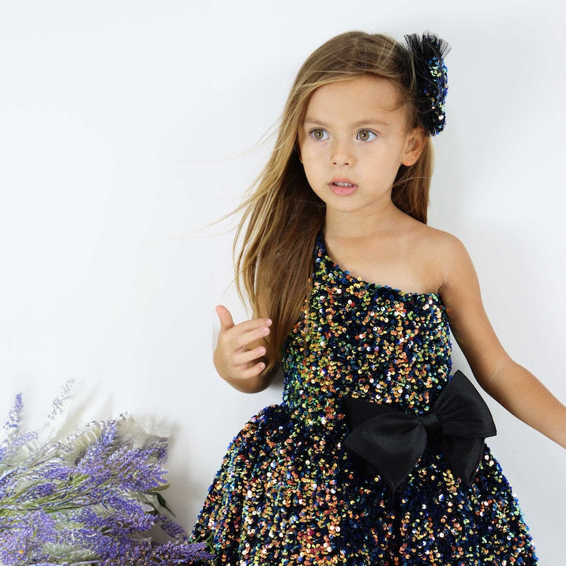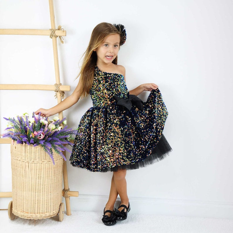 Ontdek de betoverende wereld van onze Sequin meisjes feestjurk in tijdloos zwart. Handgemaakt met liefde en gedetailleerd met sprankelende pailletten, is deze jurk perfect voor elke speciale gelegenheid. Verfijnd met een zwart strikje aan de zijkant, voegt onze feestjurk een extra vleugje elegantie toe. De 100% katoenen voering zorgt voor comfort, terwijl de ritssluiting en knielengte de perfecte pasvorm garanderen. Met een speelse een schouder stijl straalt deze jurk elegantie uit, waardoor het een ideale keuze is voor verjaardagen, galafeesten, kerst, nieuwjaar, fotoshoots en meer. Laat je kleine prinses stralen met deze feestelijke creatie, verfraaid met een subtiele aanraking van luxe.